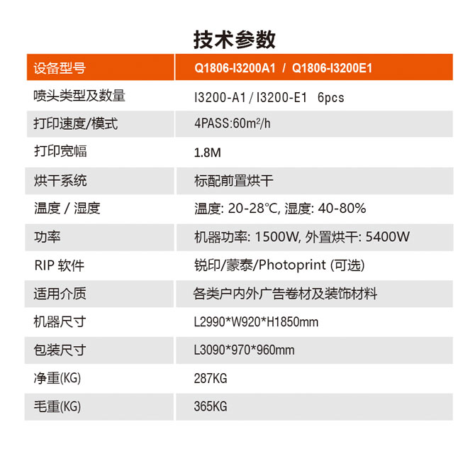 选装6个I3200-A1、I3200-E1喷头; 双动力收放系统,送布收布更精准平稳; 标配前、中、后加热; 可选配气胀轴后放后收系统,高速打印不起皱不跑偏