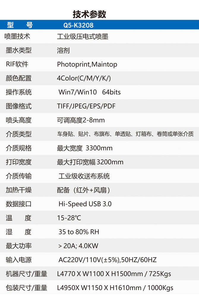 1、可选Konica KM512i或Seiko 508GS 喷头; 2、高强度铝横梁,保证机身的稳定性, 3、打印速度快,精度高; 4、采用交流伺服电机及控制技术;精准,平稳,耐用; 5、工业级负压系统,持久打印不断线; 6、3.2米宽幅,效率高,更省人工。